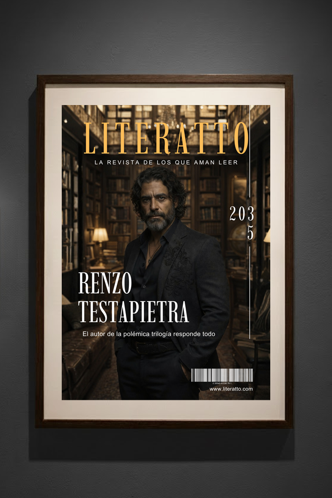 Enfoca hacia una pared donde hay una foto de Renzo en su primera firma de libros y al lado de esa foto, está encuadrado el primer ejemplar de -