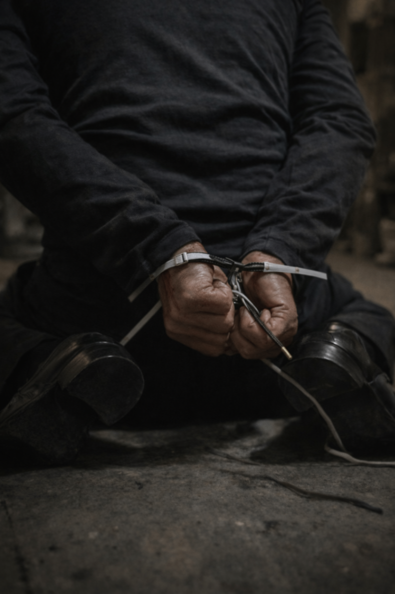 Con el índice y el mayor de la mano derecha hago pasar la punta de acetato del cordón por el estrecho hueco entre mi piel y la prisión de nylon que es el precinto. Primer milagro: pude hacer pasar un camello por el ojo de una aguja. Ahora viene la parte más complicada del truco, unir las puntas de ambos cordones con las manos maniatadas aún. Después de forcejear un poco, logro hacer el nudo. Ahora sí estamos a minutos de la libertad. Hay dos formas de hacer esto: la primera es frotar el precinto contra los cordones provocando fricción al subir las manos y moverlas hacia los lados, este método es muy útil cuando se tienen las manos atrás de la espalda. El segundo método es un poco más rápido y sencillo, con las manos atadas adelante podemos hacer un movimiento de pedaleo con los pies que provoca que los precintos se corten rapidísimo.