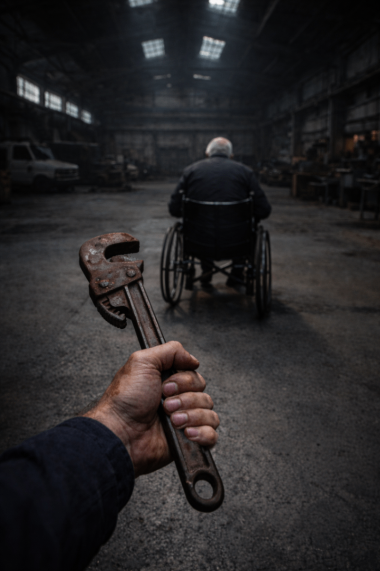 Propuesta de plan de acción: hacer un ruido tremendo y esperar que venga alguien a chequear. Hay una eslinga de remolque y uno de los autos está sobre un crique. Piola, ya tengo mi distracción. Encuentro una llave inglesa de buen peso y tamaño. En una estantería encuentro una soga también. No me puedo equivocar: tengo que incapacitar, neutralizar. No asestar un golpe letal. Será lo más difícil de todo el asunto.