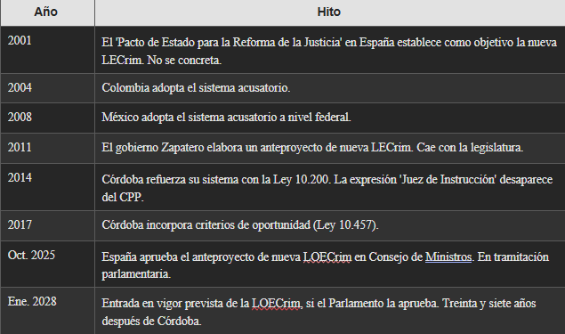 América Latina heredó de España su tradición jurídica inquisitiva, y luego la abandonó. España la conservó. Córdoba la reformó en 1991; Chile en 2000; Colombia en 2004; México en 2008. España permaneció anclada en la LECrim de 1882 hasta hoy.