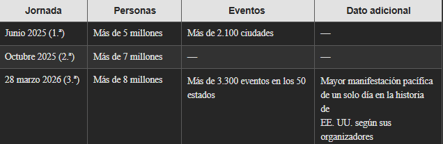 La primera convocatoria reunió a más de cinco millones de personas en más de 2.100 ciudades y pueblos. La segunda, en octubre de 2025, llegó a siete millones. La tercera, el 28 de marzo de 2026, superó los ocho millones en más de 3.300 eventos.
