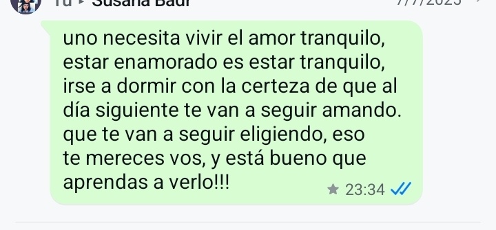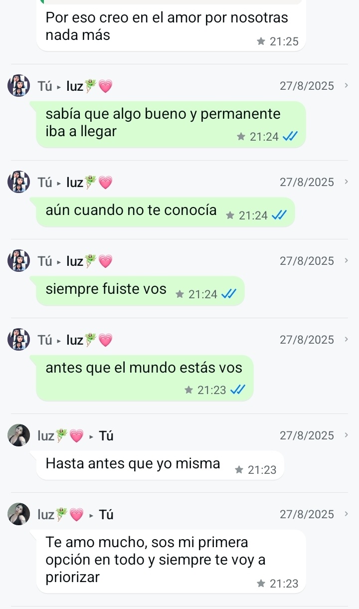 pero tengo un Sol en mi vida, Luz, hablando con un amigo en este mismo día, concluí que si ví a alguien crecer, cambiar, amar, odiar, hacerse pequeño y grande, y pequeño de vuelta, y sentir que nadie lo querría, y yo seguí ahí, eso también es una forma de amor. ser amado es haber cambiado, no soy la misma chica de catorce años que se enamoró de su mejor amiga, con ella, con mi alma gemela en esta línea de vida, si puedo afirmar que el pasado está lejos, mi presente es confuso, pero siempre estuve segura de ella, y de mi amor hacia su sonrisa —la sonrisa más linda del mundo — y aunque ese mismo sentimientos mutó y cambió su intensidad e intención, siempre estuvo ahí. algo como decir, quizá solo estoy acá, esperando a alguien para pasar mis años, pero ya la encontré. mi amor si garantizó su permanencia. lloré por su falta al nacer, siempre fue ella a quién esperé, la encontré temprano, pero no aceptaba que podía quererla tanto, antes que el mundo está ella, verla convertirse en una mujer tan increíblemente hermosa, dulce, buena, amable y altruista, me conmueve, y al mismo tiempo me hiere tanto, tanto, tanto, que se acostumbre a recibir un amor romántico que no ofrece certezas, si no más bien metaforicas extracciones de sangre que drenan su cuerpo hasta dejarlo pequeño, más pequeño que antes.