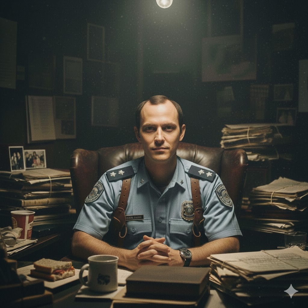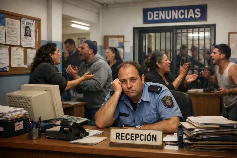El otro oficial es bastante más joven, de unos 30 aproximadamente. Cabello fino, bien corto que coquetea con la calvicie incipiente. Si quieren ir a un recital ya saben quién tiene entradas anticipadas. Afeitado bien al ras, con ojeras y mirada de que está pensando en el chegusan de milanesa completo que dejó en la heladera de la comisaría. De contextura delgada y con el uniforme impoluto, casi de desfile. Tiene pinta de ser de esa gente que sabe que está en el lugar equivocado pero justamente ahí tiene que estar como para equilibrar la balanza.
