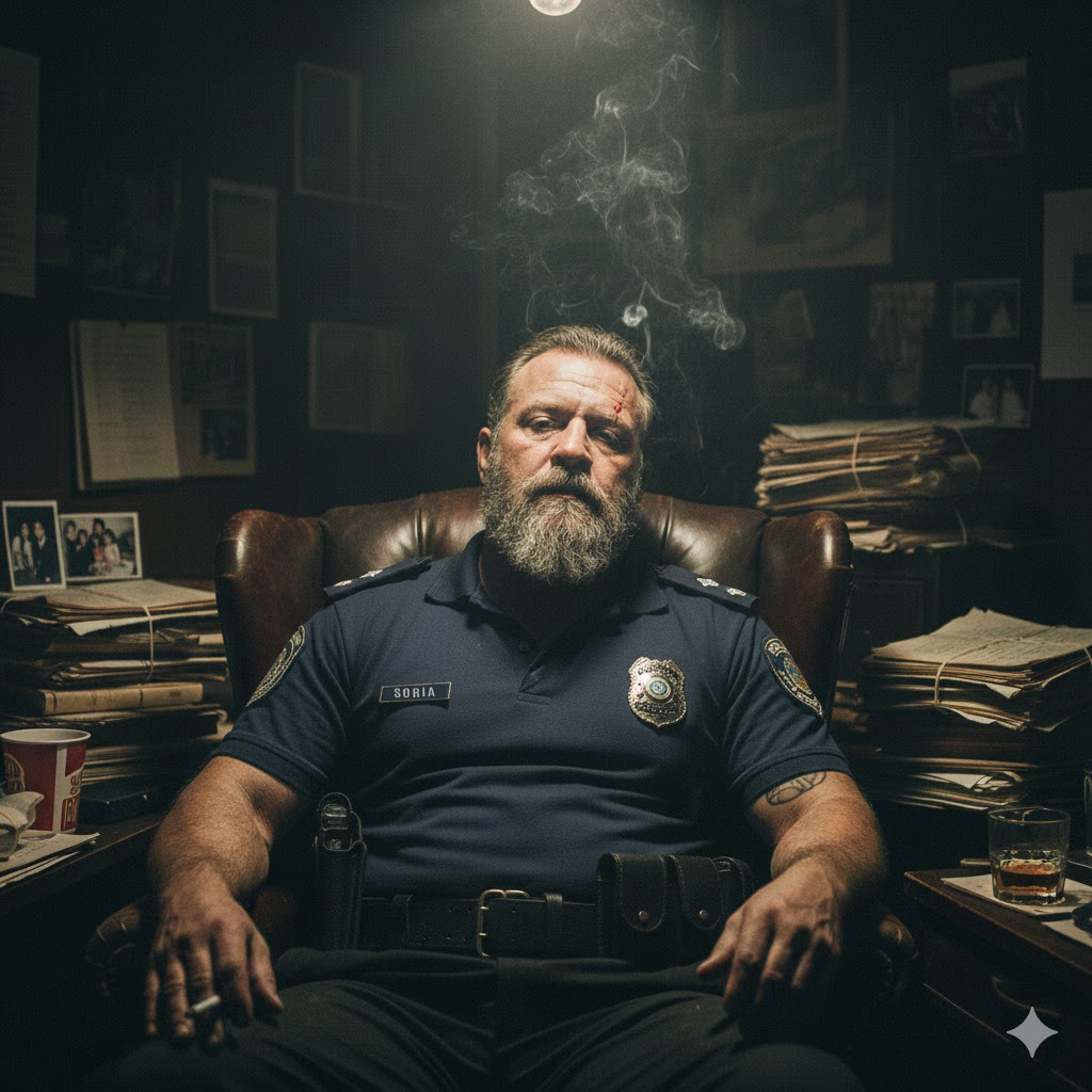 Uno de los agentes es un tipo cercano a los 50 años, con barba y un bigote que nalguearía al de Nietzsche, el uniforme desteñido al igual que su pelo por los años. Presenta un peculiar desvío en la nariz y la oreja izquierda con forma de coliflor. Yo me hubiera puesto los ganchos y me hubiera encerrado en la celda solo de verlo. Tiene pinta de que en los 70 nos hubiera electrocutado los huevos. No le saca el ojo de encima a Alfy y hasta pareciera que lo odia. O quizás quiere salir a fumarse un cigarro.
